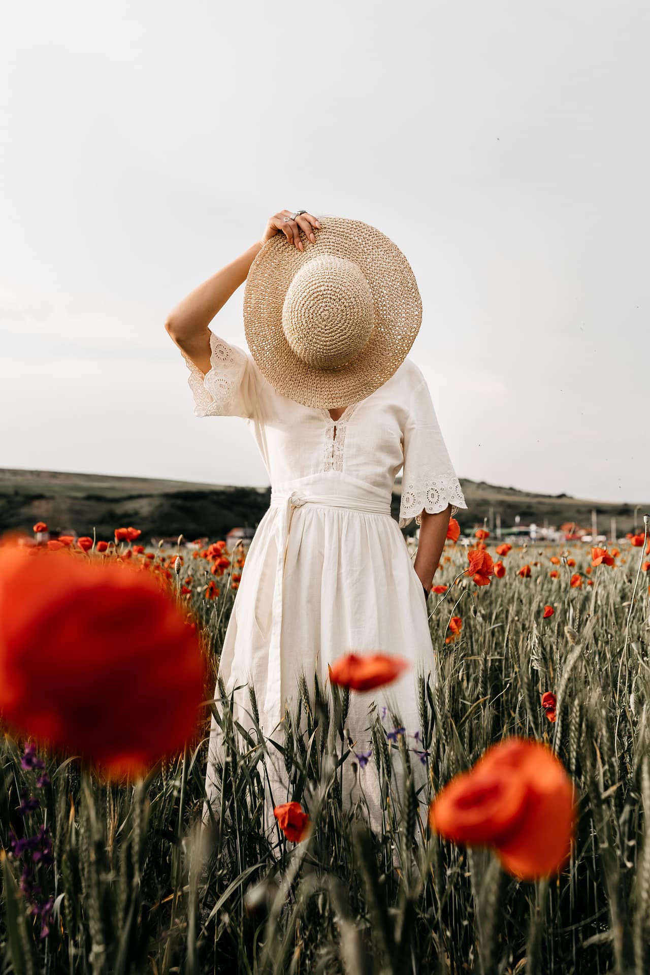 Image of woman with hat by https://www.pexels.com/photo/unrecognizable-woman-with-hat-standing-in-meadow-with-flowers-7137432/